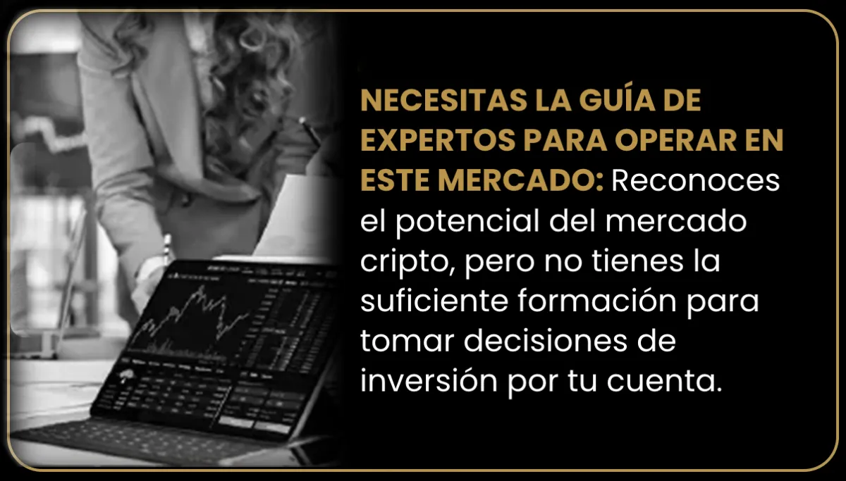 NECESITAS LA GUÍA DE EXPERTOS PARA OPERAR EN ESTE MERCADO: Reconoces el potencial del mercado cripto, pero no tienes la suficiente formación para tomar decisiones de inversión por tu cuenta.