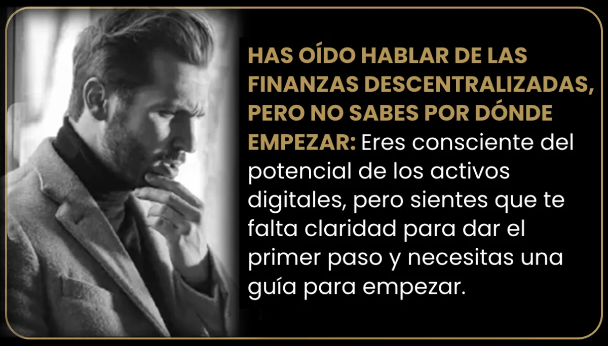 HAS OÍDO HABLAR DE LAS FINANZAS DESCENTRALIZADAS, PERO NO SABES POR DÓNDE EMPEZAR: Eres consciente del potencial de los activos digitales, pero sientes que te falta claridad para dar el primer paso y necesitas una guía para empezar.
